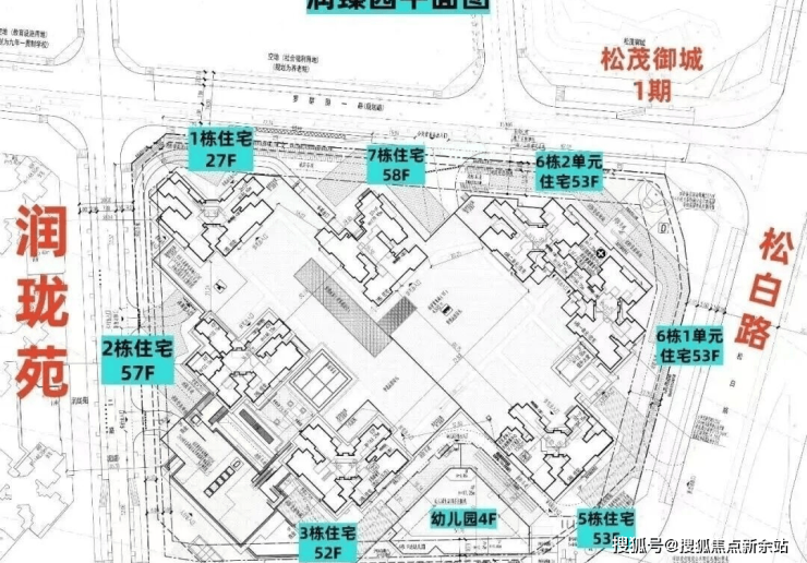 润臻园占地面积约2.98万㎡,容积率7.19,由7栋总高26-57层高的住宅组成,还有1所9班幼儿园。