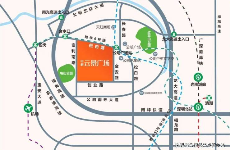 双地铁上盖综合体:6号线/13号线(规划中)公明广场站联通地下商业,6号线已通车;周边地铁18、29号线规划中,南光、龙大双高速免费通行,便捷通达南山、福田中心;广深港高铁已投入使用,30分钟速达香港西九龙,赣深高铁的建设,实现粤港澳大湾区半小时生活圈。