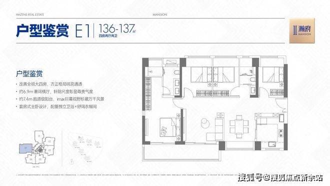 07(E1)户型,横厅朝西南,客餐厅开间6.9米开间,LDKB一体化设计,四开间朝南,全屋7面飘窗,主卧套房+步入式衣帽间,3个次卧朝东北向,客厅连接次卧出7.4米长的超大阳台。得房率约78%(不含赠送)。
