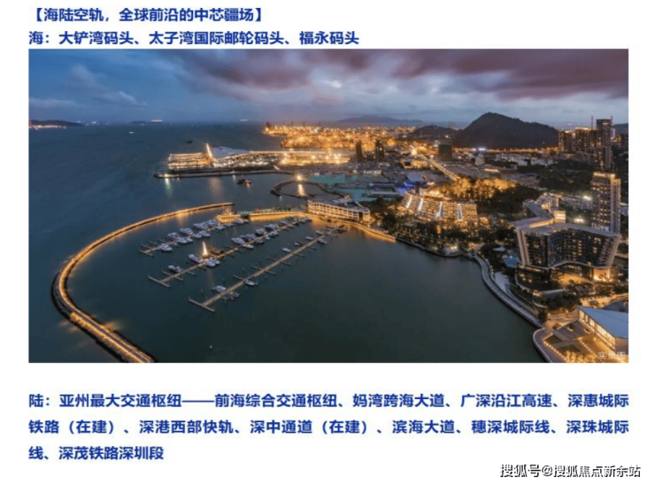 陆:亚州最大交通枢纽——前海综合交通枢纽、妈湾跨海大道、广深沿江高速、深惠城际铁路(在建)、深港西部快轨、深中通道(在建)、滨海大道、穗深城际线、深珠城际线、深茂铁路深圳段