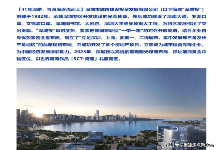 深圳市城市建设投资发展有限公司(以下简称“深城投”)创建于1982年,承载深圳特区开发建设的光荣使命。先后成功建设了深南大道、罗湖口岸、文锦渡口岸、深圳图书馆、大剧院、深圳大学等多项重大工程,为特区发展作出了突出贡献。“深城投”审时度势,紧紧把握国家新型“一带一路”的对外开放战略,结合企业自身优势紧密全盘布局,确立了“立足深圳、上海,面向一、二线城市,集中发展珠三角及长三角地区”的战略规划布局,并成功开发了多个房地产项目,立志成为城市运营先锋企业,为中国经济发展添彩助力。2023年,深城投以高远的前瞻眼光谋略布局,择址前海黄金中轴区位,以世界湾海作品「SCT·湾流」礼献湾区。
