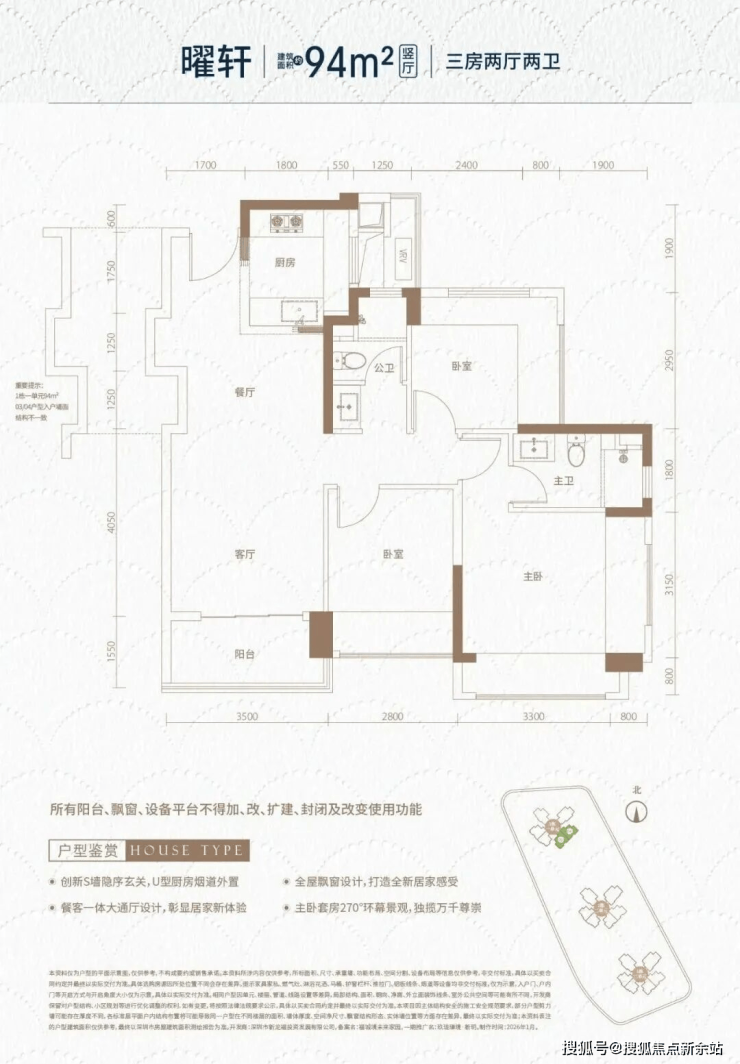 94㎡的3房2厅2卫(横厅),设计的是横厅南北通透格局,独门独户,进门入户玄关,客餐厅5.65米开间,LDKB一体化,全屋10面飘窗,主卧南北通,分别做到了主卧16.38㎡/次卧12.02㎡/次卧9.9㎡(包含墙体飘窗),L型厨房,卫生间干湿分离,得房率约105%(包含赠送),阳台约5.42㎡主朝西南向。