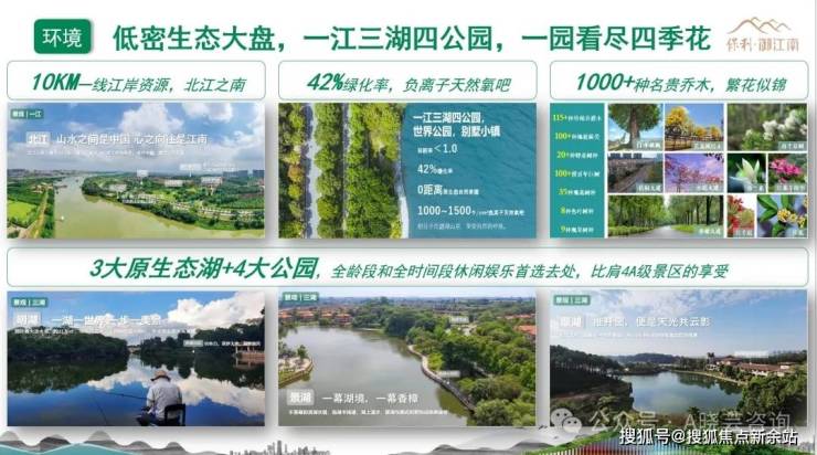 项目邀请国际顶级设计团队进行规划设计,在规划上保留了大量的原生态资源。斥资20 亿重金打造“1 江 3 湖 4 公园”的大园林景观:10 里的北江景观资源,三大原生态湖泊,邻近销售中心的 2.8 万㎡景湖;紧邻江南汇酒店 2 万㎡的翠湖;还有面积最大 21 万㎡的明湖;围绕明湖,还建有一个明湖公园,里面有一条 3 公里的环湖自行车道。