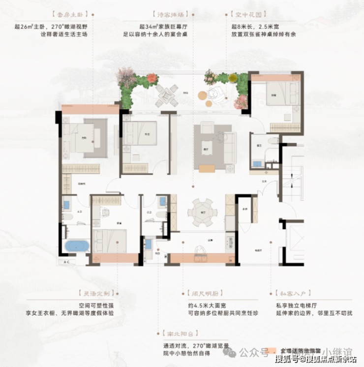 五花园:前庭后院,首创「五花园」式的设计满足长辈种花种菜的小爱好和儿孙玩闹的空间