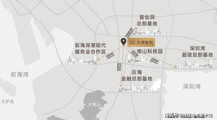 后海金融总部基地、深圳湾超级总部基地(东南向约6km):中国总部企业最为密集区域之一,规划就业人口约为54万人。