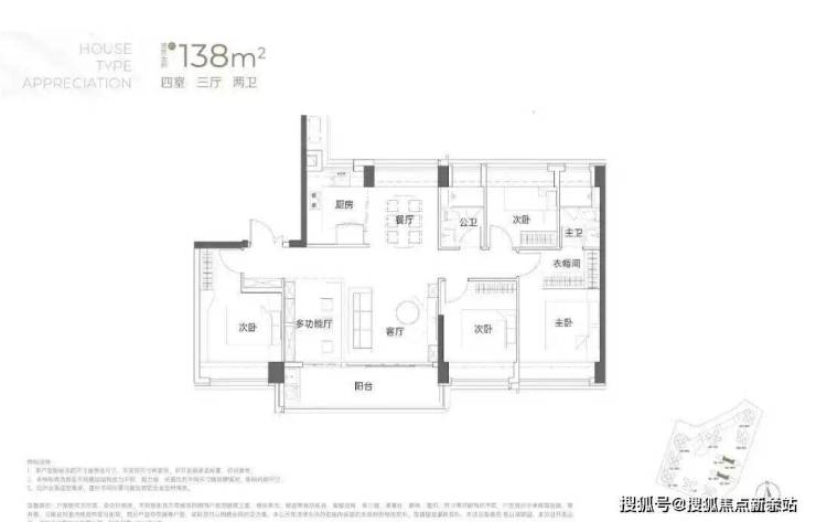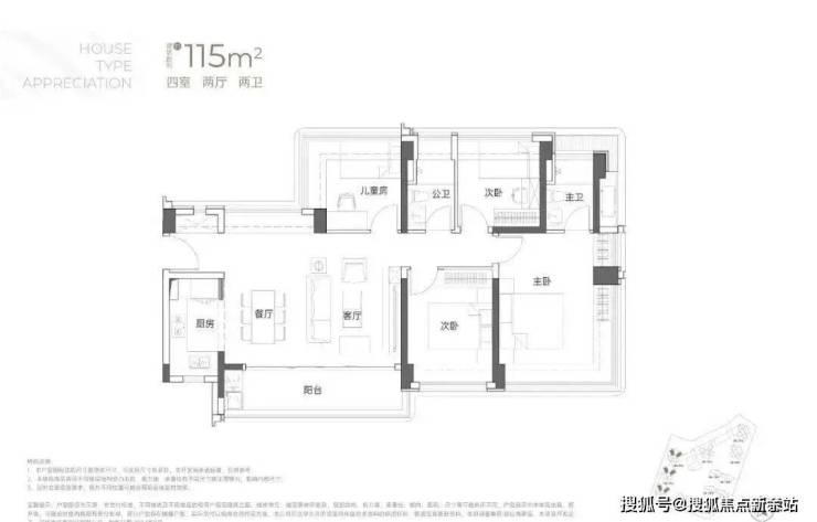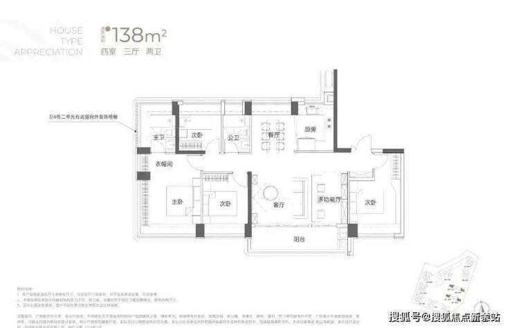 竖庭格局,西南向,基本居住功能与建面约108-110㎡4房2卫一致,但格局不一样,从目前公布的户型图上看,主要是主卧空间有了更大的提升,比如可以放更大一点的衣柜。