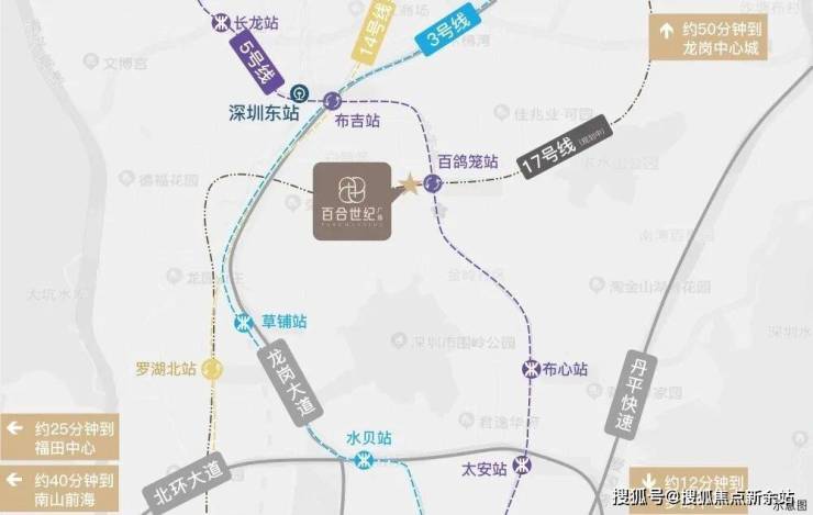 交通配套:百合世纪广场紧邻地铁5号线百鸽笼站(步行约100米),且未来规划有17号线罗岗站约450米在此交汇,形成双地铁上盖优势,通过地铁5号线,1站可换乘3/14号线,4站直达福田核心区,7站快速通达深圳北站,高效串联南山、前海等区域。