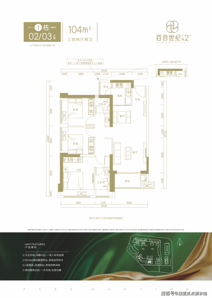 104㎡的3房2厅2卫,1栋02/03户型,设计的是竖厅格局,客厅3.6米开间,LDKB一体化设计,三开间朝南,动静分区,L型厨房带1个生活阳台,公卫三段式干湿分离,得房率约76%(不含赠送),正南朝向。套内面积79.04㎡+赠送10.31㎡=实得89.35㎡,加上赠送得房率约85.91%。