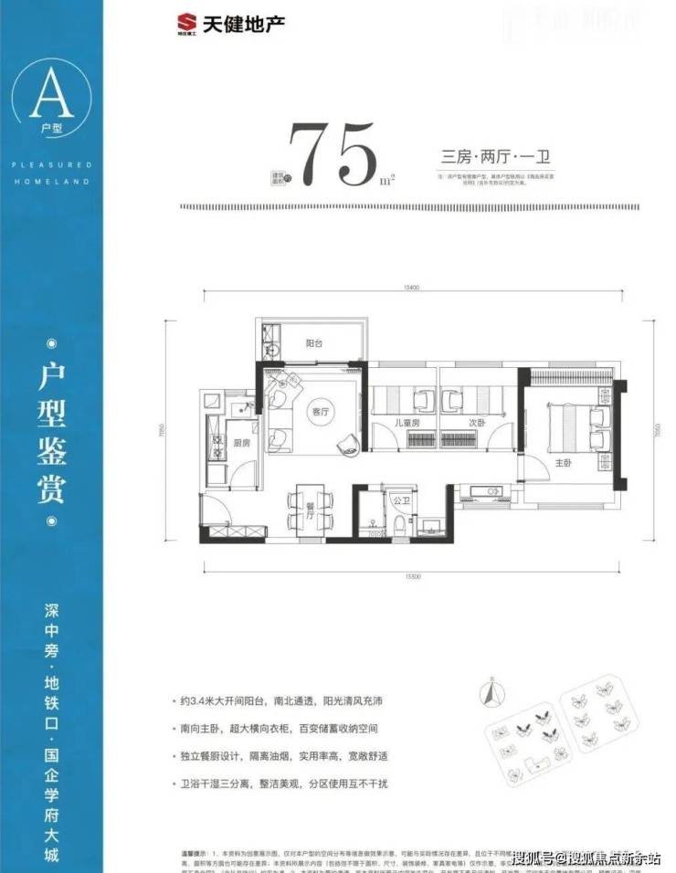 75㎡的3房2厅1卫,设计的是竖厅南北通透格局,进门入户玄关,客厅3.4米开间,得房率81.3%(不含赠送),阳台朝西北或东北向。
