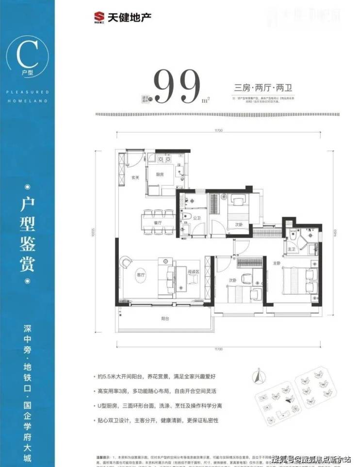 99㎡的3房2厅2卫,设计的是经典竖厅格局,可以改4房,进门入户玄关,客厅5.3米开间,三开间朝南,得房率81.7%(不含赠送),阳台朝西南向。