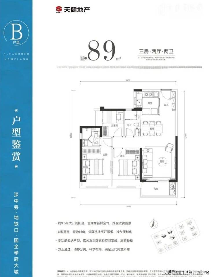89㎡的3房2厅2卫,设计的是经典竖厅格局,进门入户玄关,客厅3.5米开间,三开间朝南,得房率81.3%(不含赠送),阳台朝西南或东南向。
