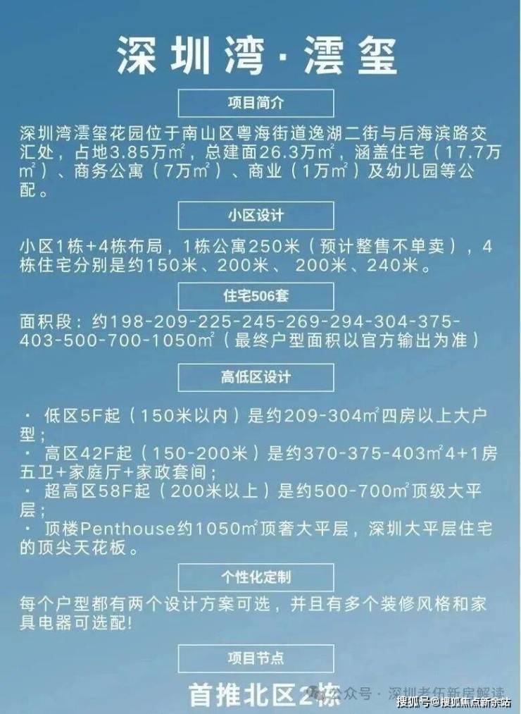最新消息来了!去年深圳湾地王新豪宅竞标方案曝光!且最终名定为:【深圳湾·澐玺】,效果图看着十分高大上,五栋住宅楼,采用全玻璃幕墙设计,户户海景!将按第四代住宅标准设计,实用率传将达到92%以上,品质和景观都十分值得期待!项目官方全套面积户型正式曝光:209㎡-269㎡-294㎡-304㎡-400㎡-500㎡-700㎡-1050㎡,预计十月份开展厅,11-12月左右入市!