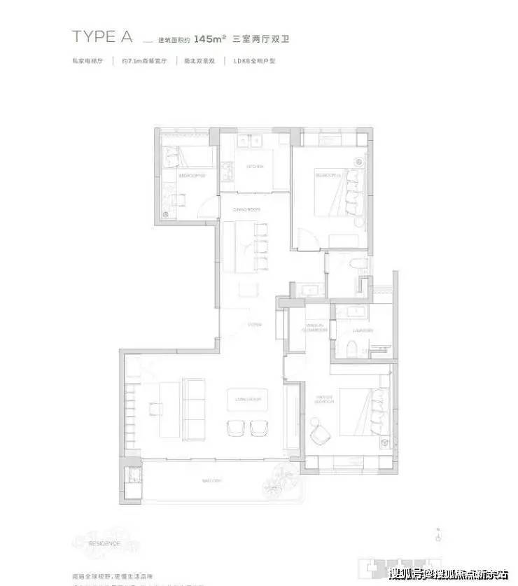 145产品为三房两厅两卫产品,餐厨一体化设计, 7米宽厅可切换各种生活场景,畅享宽幕般景观界面。