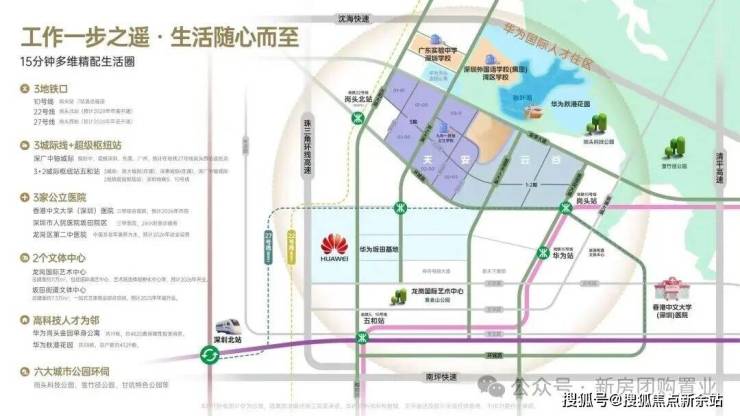 高精尖圈层聚落:毗邻华为总部基地,周边吸引了康冠、神舟等众多知名企业,培育了逾600家高新技术企业。作为全球第三大万亿级电子信息产业集群承载区,这里汇聚了庞大的高素质精英人群,区域发展前景较为广阔。