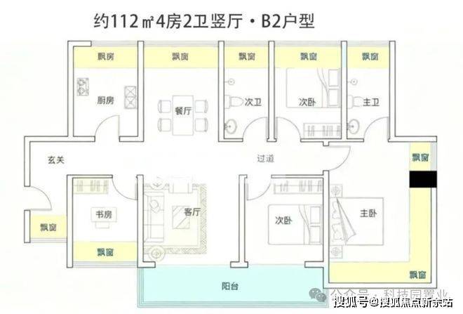 约105-122㎡四房:作为“功能型品质起步”户型,凭借新规下的高实用率(包含赠送得房率约100%)。主卧均带270°环绕式飘窗,户型设计通过飘窗“送了不少面积。