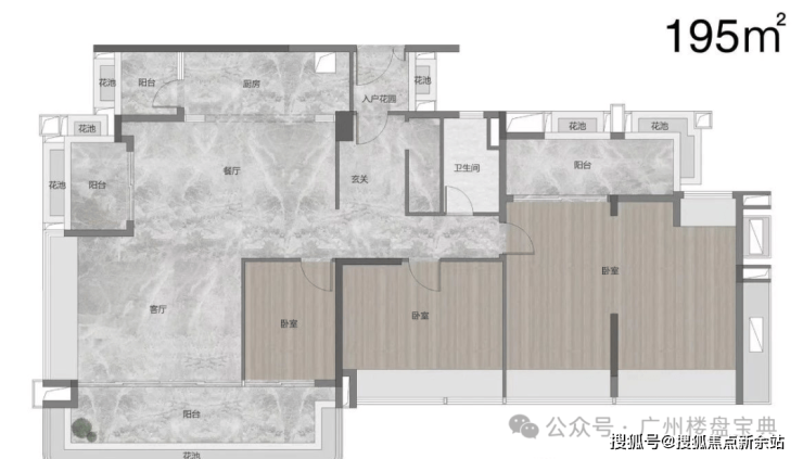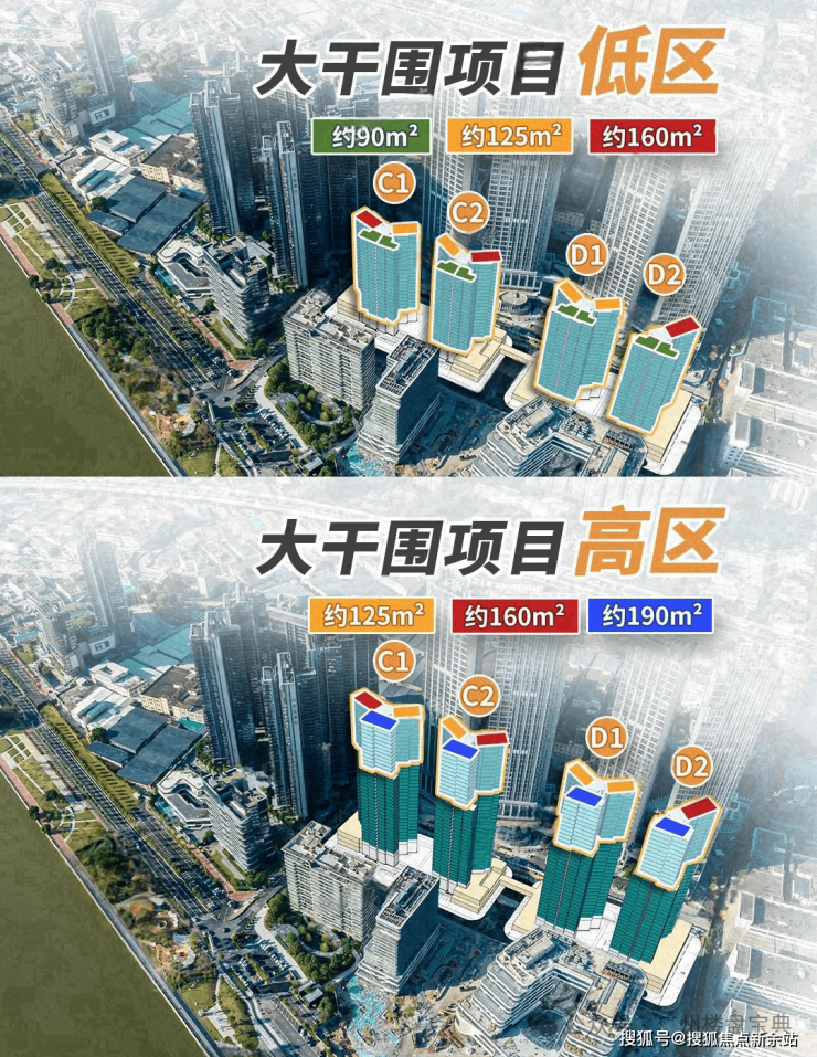 高区25-37楼,2梯3户,面积段有120、160、195平三个面积段。