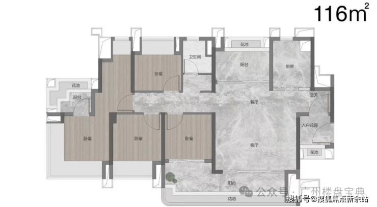 建面116平,该户型并没有做样板房,带入户花园,五开间朝南,南北对流,通风和采光都非常好。