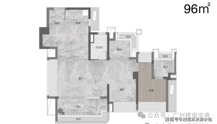 建面95平,该户型可以做三房或四房,项目的样板房是打通了一个房做了3房这样整体空间感会比较强。