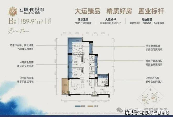89㎡3房2厅2卫:设计的是经典横厅格局,LDKB一体化,进门入户玄关,客厅带3.5米阳台,U型厨房,主卧南北通透270度景观,卫生间干湿分离。