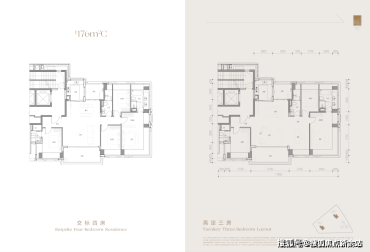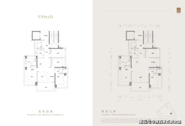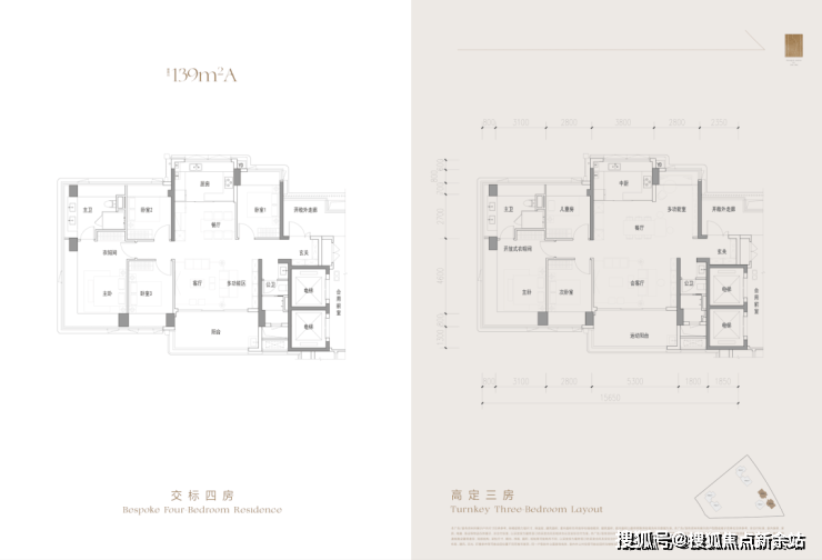首先来看看139㎡A户型,位于3栋的两个东西端头位,2梯3户、3.1米层高,采用竖厅南北通透设计,配备独立入户前室与玄关,主卧搭载270°无柱转角飘窗,作为入门级改善优选,其核心亮点的是可自由切换三房、四房。选三房可让餐厅区域有效扩展,形成阔绰的餐客厅,茶室或多功能区域,选四房可满足多成员居住需求。可选用SCD设计的两种装修风格。需留意,西端户可俯瞰社区公园与双界河东段,东端户以城市景观与园景为主,但需要注意与同层B户型的对视问题,如果非常介意对视问题的朋友可能就不是非常适合该户型了。
