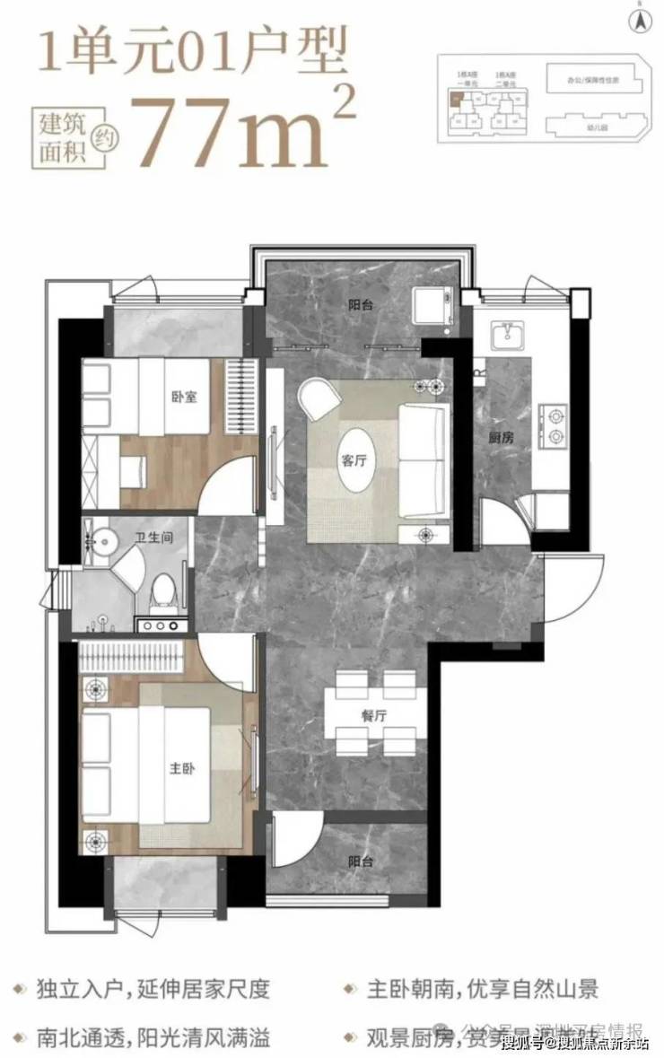 77㎡的2房2厅1卫,1栋1单元01户型,设计的是竖厅南北通透格局,独立入户,客餐厅分离设计,动静分区,南北双阳台,L型厨房,卫生间干湿分离,客厅阳台正北朝向。小户型里面难得可以做到南北通透且有双阳台的格局。