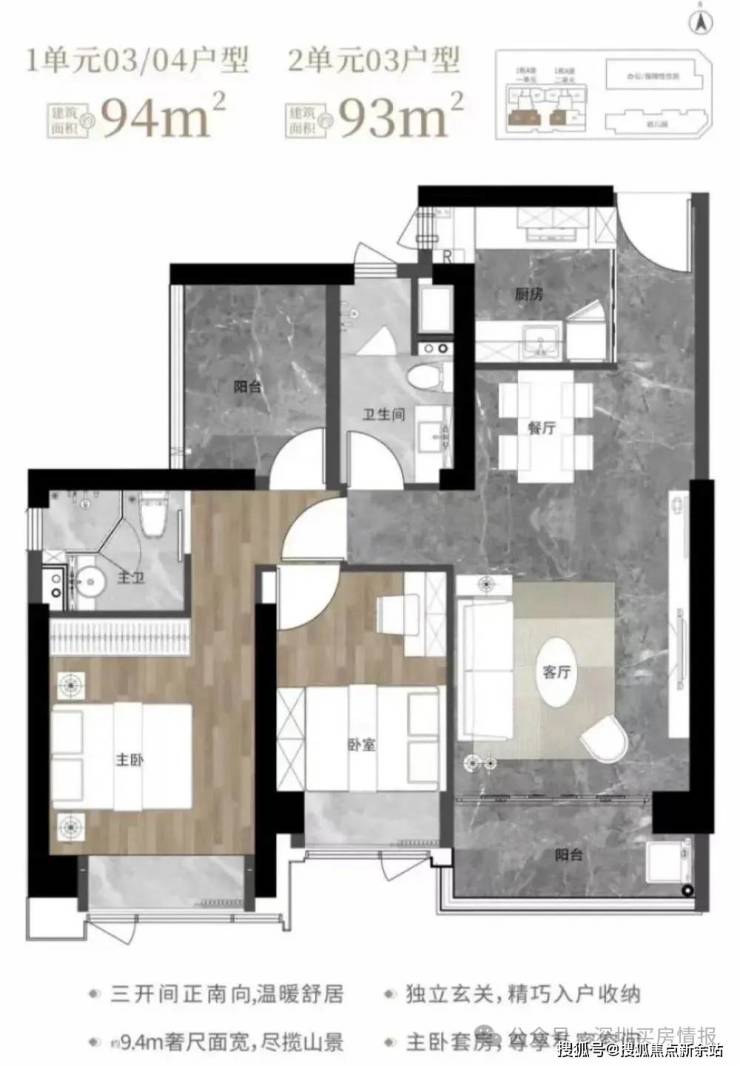 93-94㎡的3房2厅2卫,1栋1单元03、04户型/1栋2单元03户型,设计的是经典竖厅格局,客厅3.6米开间,LDKB一体化设计,动静分区,三开间朝南,9.4米面宽,二字型厨房,卫生间干湿分离,阳台正南朝向。