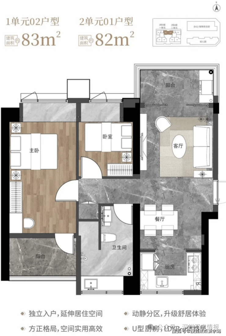 82-83㎡的3房2厅1卫,1栋1单元02户型/1栋2单元01户型,设计的是竖厅南北通透格局,独立入户,客厅3.2米开间,LDKB一体化设计,动静分区,南北双阳台,U型厨房,卫生间干湿分离,阳台正北朝向。