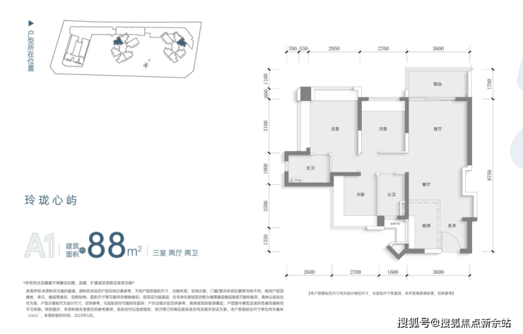 建面约88㎡三房两卫户型:打造约3.6m舒适宽厅;主卧套间双飘窗设计,次卧尺寸及方正度提升,两面凸窗满足2*1.2m床布置。