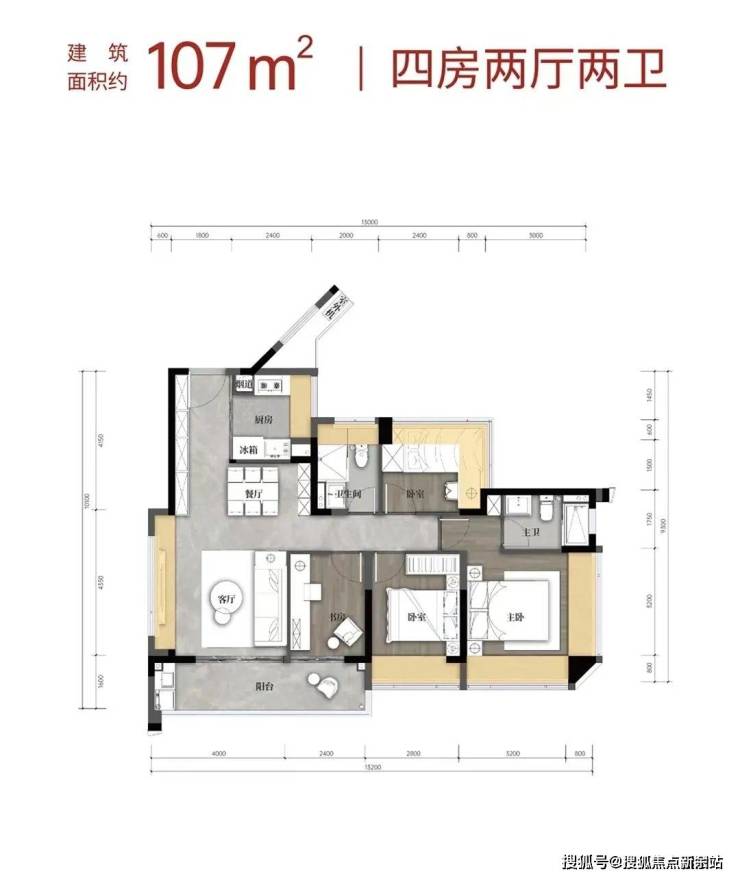 建面约107㎡做到四房两卫:这是二胎家庭或需要居家办公人士的“终极解决方案”。