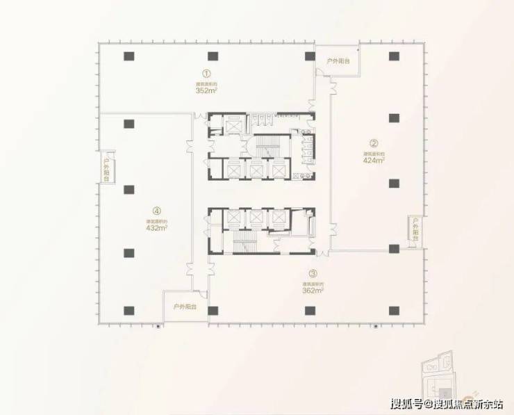 研发办公B座 约2.8万㎡,23层,标准层约1570㎡,层高4m,荷载300kg/㎡,每层4户,户型面积区间约352-432㎡,其中2户配私享阳台,每层设双共享阳台,顶层超大景观阳台。