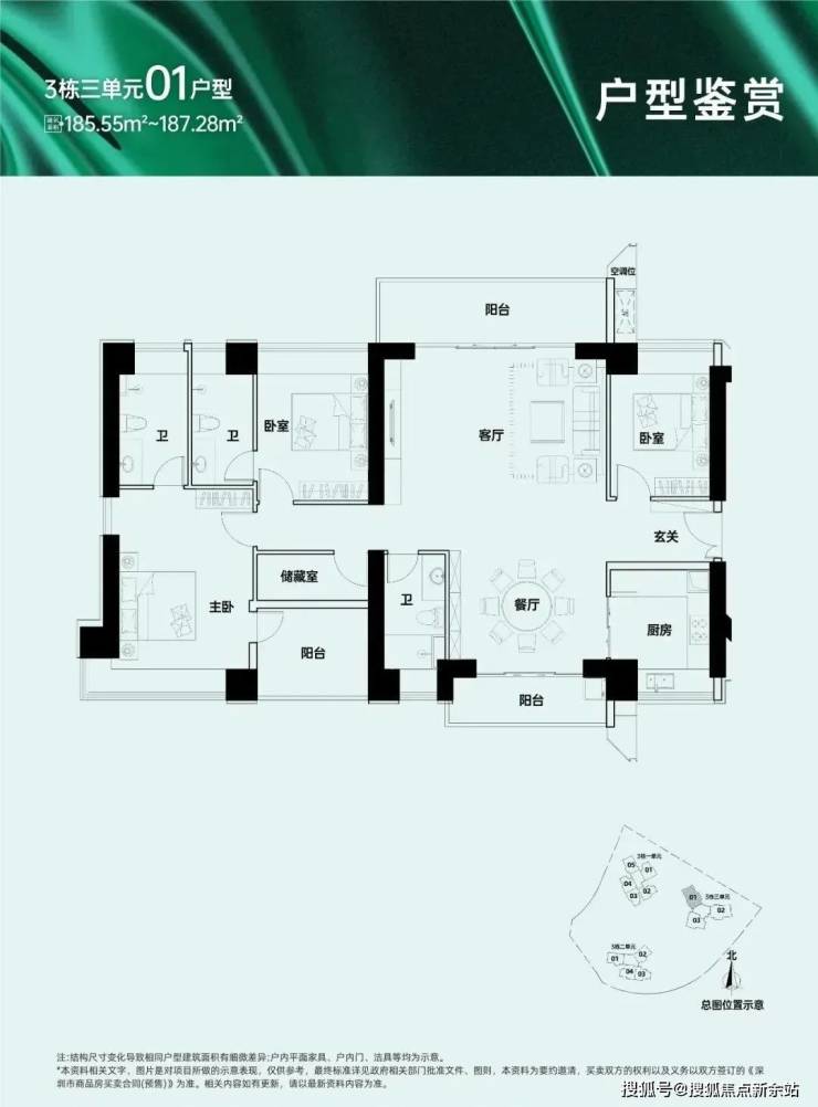 项目A区总户数1014户,由1栋、2栋、裙房组成,其中1栋分为五个单元,一栋一单元为保障房共331户,一栋二单元至五单元为商品住宅共683套,户型面积包括109-112㎡三房两厅两卫、121㎡四房两厅两卫、157-159㎡五房两厅三卫和168-169㎡五房两厅三卫。