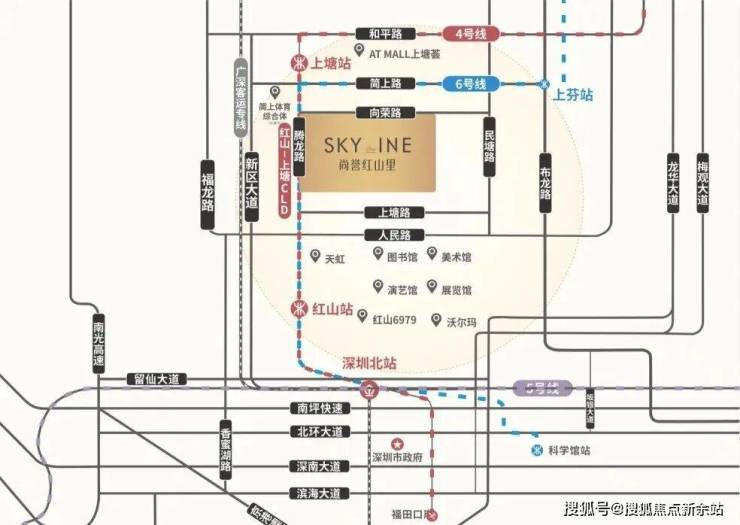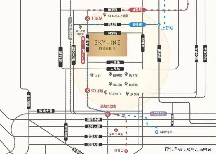 地铁交通:3地铁串联(地铁4号线上塘站约700米、4/6号线交汇站-红山站约1400米),以及6号线上芬站约1000米;1站抵达深圳北站,快速换乘5号线;7站可抵达市民中心;