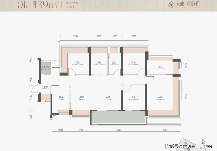 建面约115㎡四房与139㎡五房户型,都是横厅设计,户型基本一致,区别在于139㎡多了一个房间。