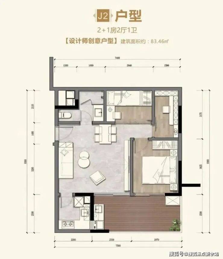 J2户型【83.46㎡】2+1房2厅1卫