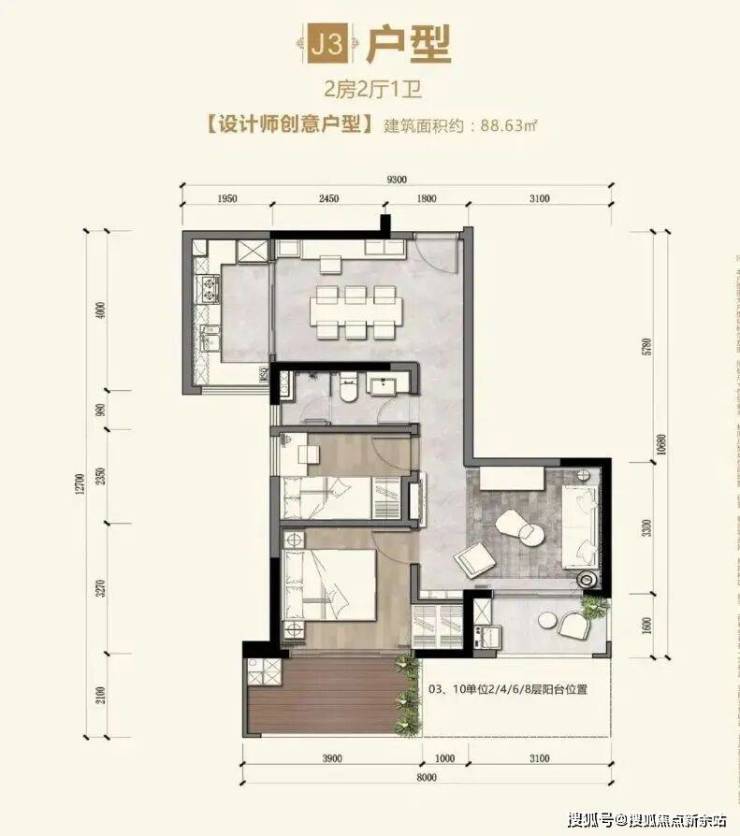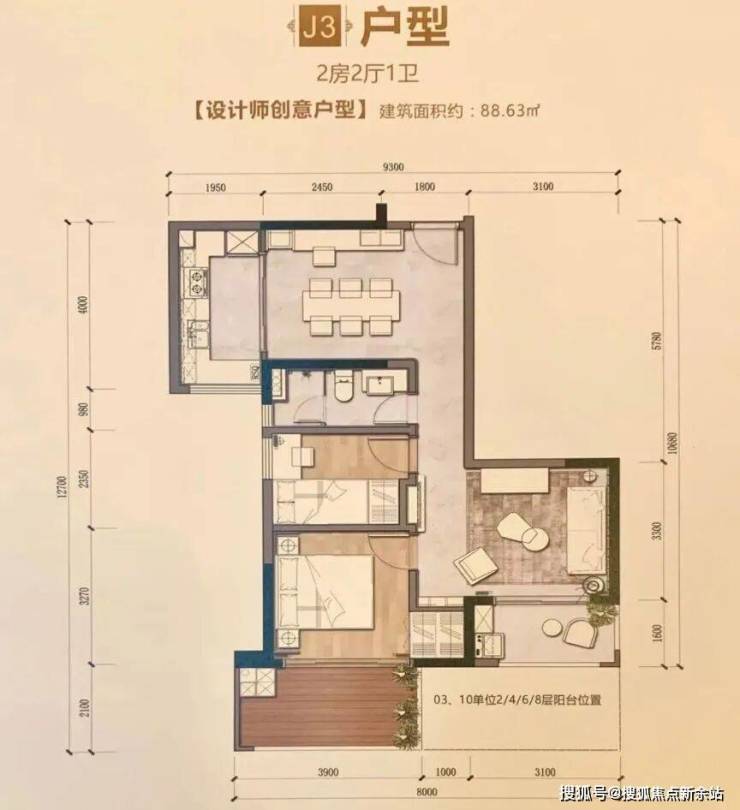 J3户型【88.63㎡】2房2厅1卫