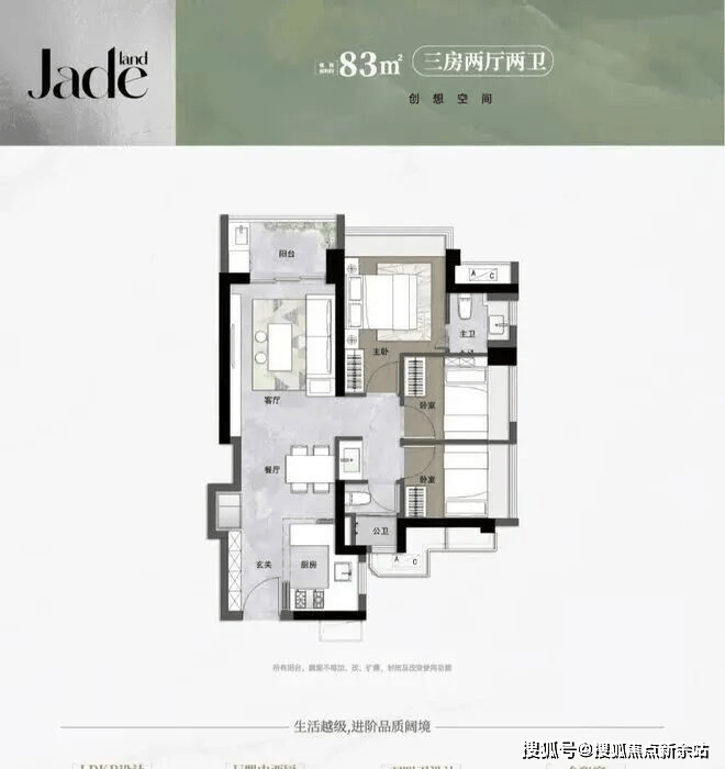 83㎡的3房2厅1.5卫,设计的是竖厅格局,进门入户玄关,LDKB一体化,S墙设计预留冰箱卡槽位,U型厨房,主卫少了淋浴,公卫三段式分离,得房率约92%(包含赠送),阳台西北朝向。