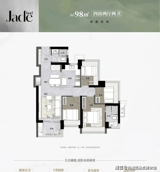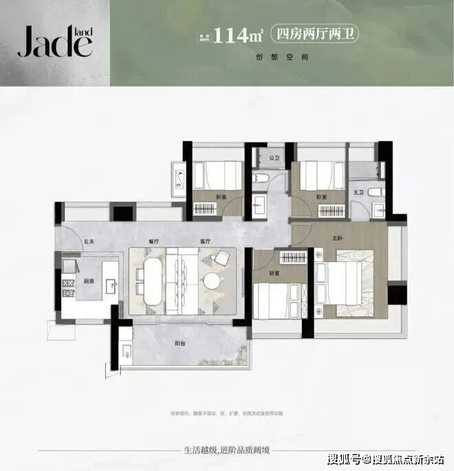 114平㎡的4房2厅2卫,设计的是横厅南北通透格局,进门入户玄关,LDKB一体化,五开间朝南,全屋9面飘窗,主卧大套间,U型厨房,卫生间干湿式分离,得房率约92%(包含赠送),阳台主朝东南向。