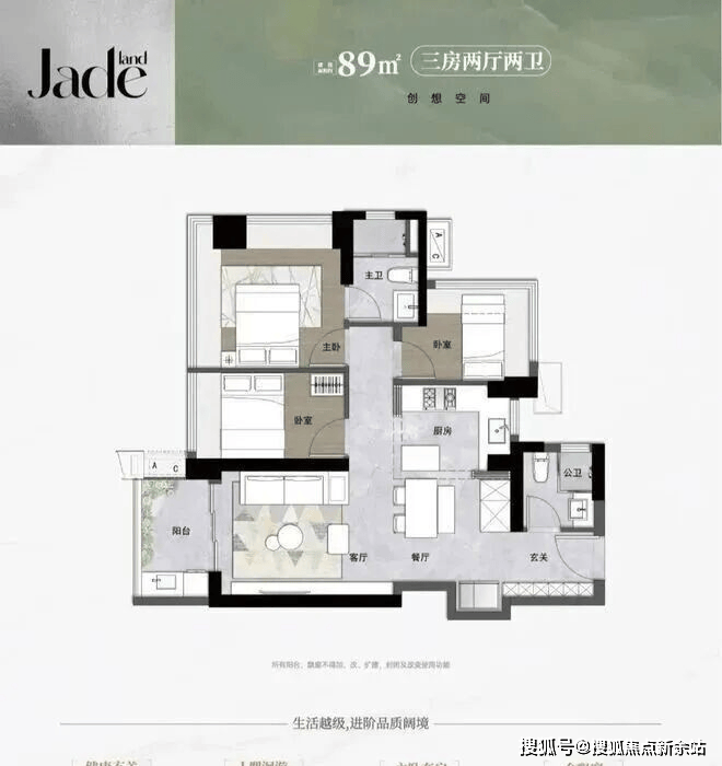 89㎡的3房2厅2卫,设计的是经典竖厅格局,进门入户玄关,LDKB一体化,S墙设计预留冰箱卡槽位,三开间朝南,主卧+1个次卧270度飘窗,L型灵动式厨房,卫生间干湿分离,得房率约92%(包含赠送),西南或东南朝向。