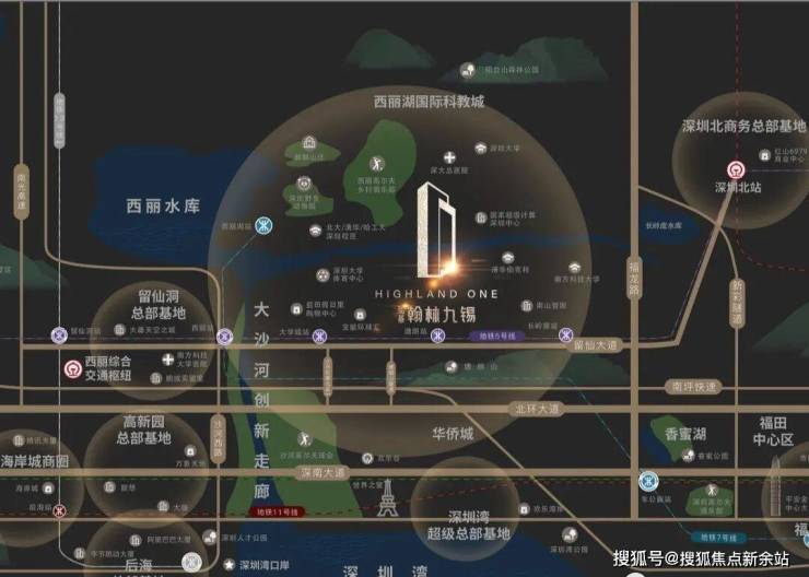 留仙大道正席,紧邻地铁5号线塘朗站,4/5/7号线3轨环绕,毗邻“三纵五横”主干道,瞬息通达全城。西丽高铁站(建设中)、深圳北站两大枢纽环绕,拥有世界交通能级。