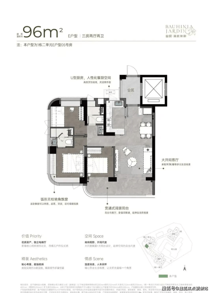 从空间布局来看,U 型厨房的设计极为人性化,大开间客厅与宽阳台是整个户型的最大亮点,西南向视野使得整个户型采光充足,贯通式阔景阳台与客厅、卧室双通,极大地拓展了生活空间的宽度。主卧的飘窗台也是一大亮点,弧形无柱转角飘窗不仅提供了广阔的视野,还增加了室内的采光。