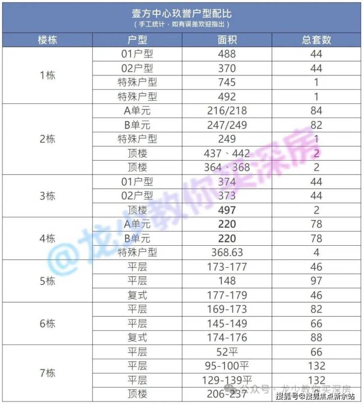 户型面积区间为52-95-101-129-139-148-174-177-220-249-373-488㎡,另外还有少量特殊复式单位。