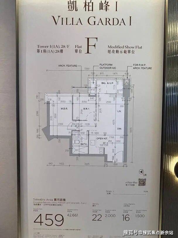 连装修经改动示范单位,单位参照第1A座28楼F室,实用面积459方呎,两房间隔。