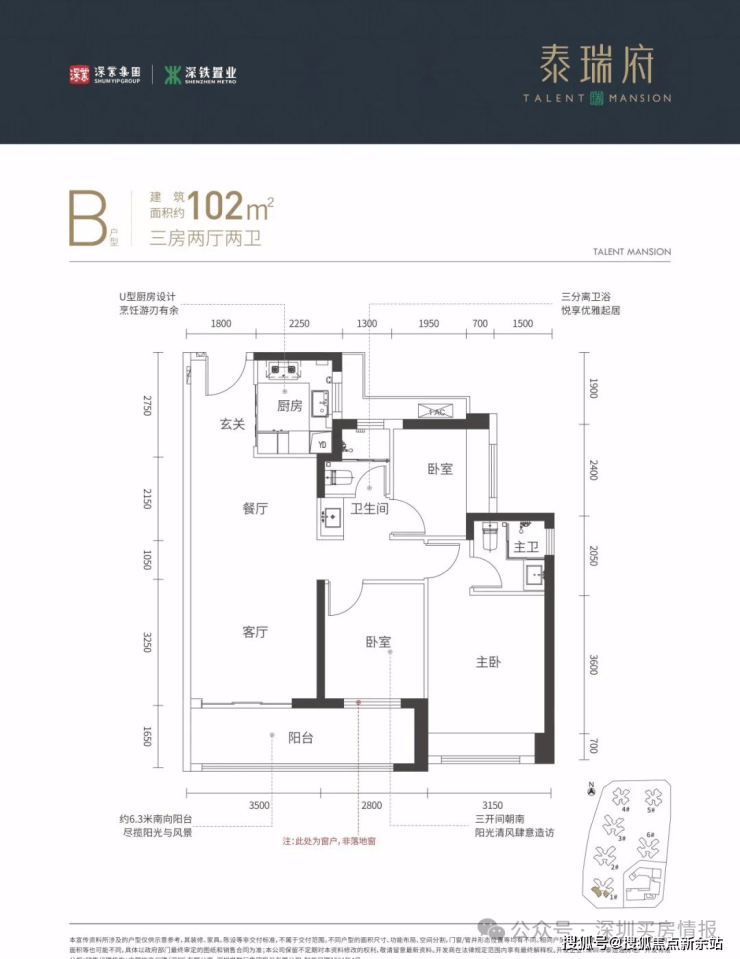 102㎡的3房2厅2卫,设计的是竖厅格局,进门入户玄关,客厅3.5米开间,三开间朝南,3个卧室分别做的3.15米/2.8米/2.65米的宽度,客厅连接次卧出6.3米长大阳台,U型厨房,卫生间三段式分离,得房率:77.48%(不含赠送),西南或东南朝向。