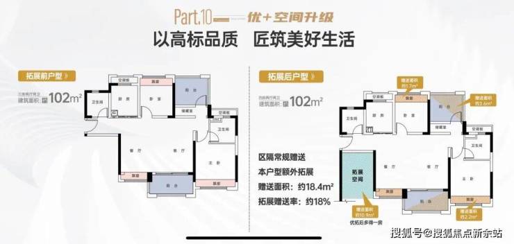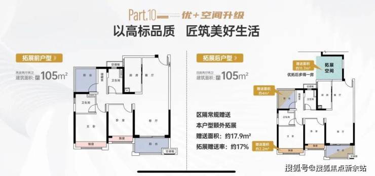 项目户型实用率超100%,因为这个项目和其他项目一样飘窗全赠送,阳台半赠送。但是这里有一个房间是半赠送,一个房间是全赠送,所以实用率就非常高。87平做三房两卫,102和105平做的四房两卫。小区的幼儿园和九年制公立学校也已经开学。这个学校是63班制的公立,后期业主不用担心说上不了学的问题