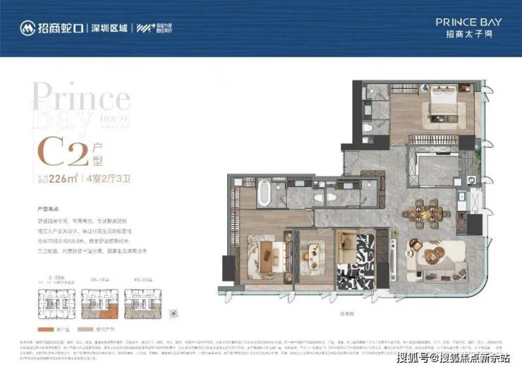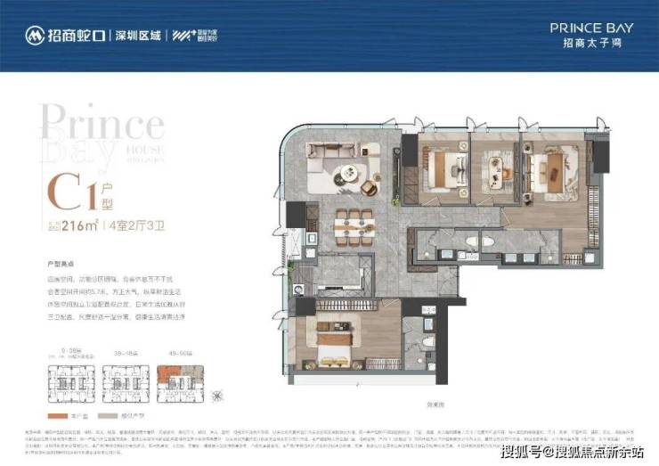 4居室(216-415㎡): 高端户型,216㎡户型厨房为封闭式设计,配备两个主卧套房;415㎡户型分布在8-31层,拥有东南、西南看海,东北看大小南山+部分海景的多重景观。