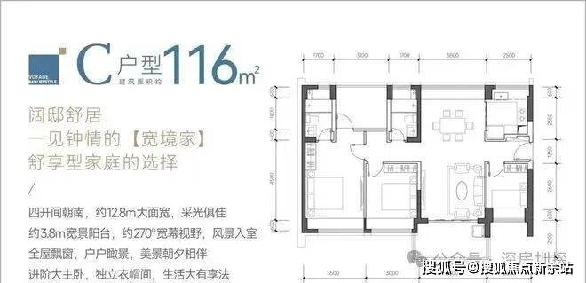 116㎡的4房2厅2卫,C户型,设计的是竖厅南北通透格局,餐客厅一体化设计,客厅3.8米开间,四开间朝南,4个卧室分别做到了主卧17.85㎡/次卧11.4㎡/次卧9.3㎡/次卧8㎡(包含墙体飘窗),都不用搭配飘窗做床,U型厨房,卫生间干湿分离,得房率约:93.13%(包含赠送),阳台主朝西南、东南或正南向。