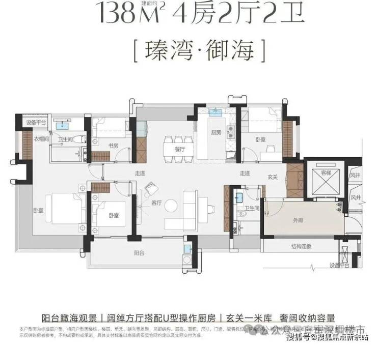 建面约138㎡户型,为1栋1单元独有户型,采用LDKB大方厅布局,可规划"X空间"(开放式书房、茶室),比143㎡少5㎡却实现同等功能,西南向享海景,东北向卧室看城市景观,真正做到南北通透。