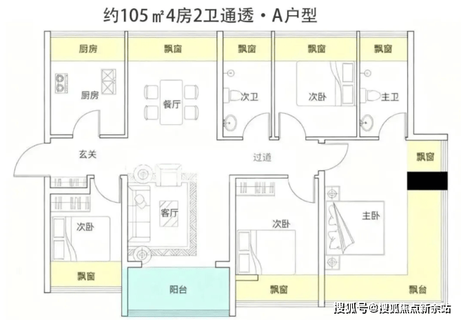 这个户型比较特别,是竖厅+双龙抱珠格局(也就是卧室分布在客厅两侧,动静分区更灵活)。进门独立玄关,餐客厅一体化。四开间朝南,全屋8个飘窗,飘窗数量略少于前几个户型,但主卧和其中一个次卧都做了270°无柱转角飘窗,双转角飘窗在同面积段里很少见。阳台连接客厅与次卧,西南朝向大阳台。