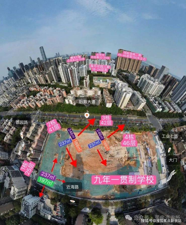 作为焕新深圳南山片区的重要组成部分,该项目将规划占地14969㎡,总建面150843㎡,计容建面111267㎡ ,容积率7.43,其中:住宅98754㎡,商业、办公及旅馆业建筑2100㎡,公共配套面积8205㎡。项目有4栋25-46层高住宅组成,还配建一所九年一贯制学校,