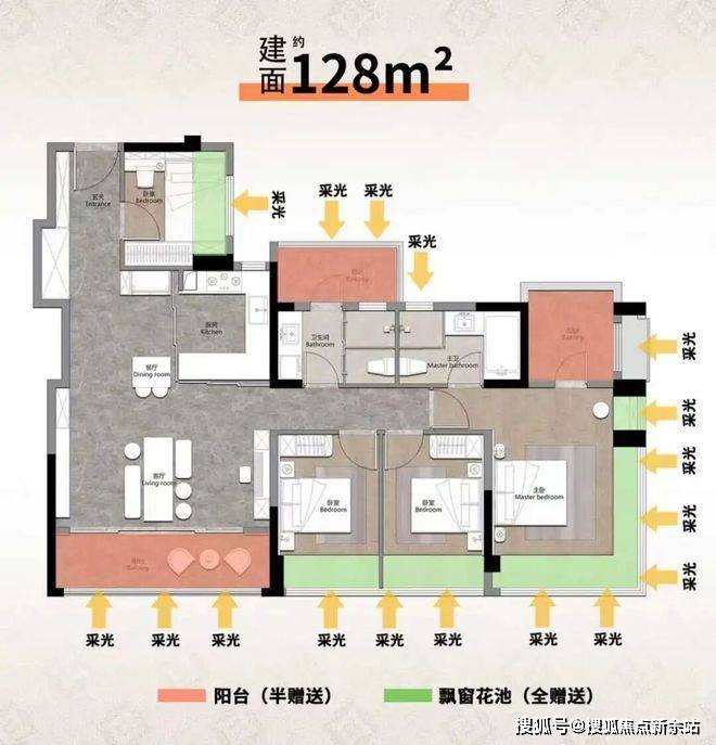 约128㎡四房双卫户型:客厅约5.5m东南看海、公卫创新五分离设计、超配家政间、生活阳台,空间更高效。主卧套房配置独立衣帽间,专享尊崇礼遇。